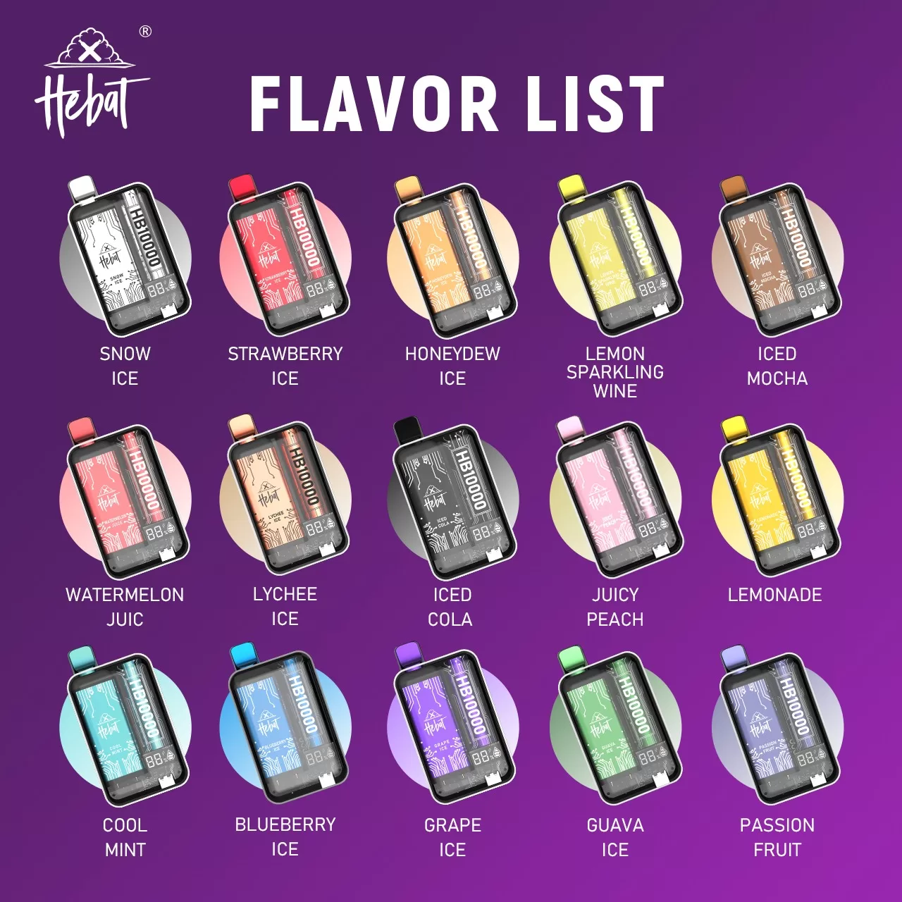 HEBAT喜貝10000口一次性電子煙特別適合重度使用者與經常出行族群,建議依個人口味偏好多支搭配選購,實際風味陣容與優惠活動以造霧主當前頁面標示為準。